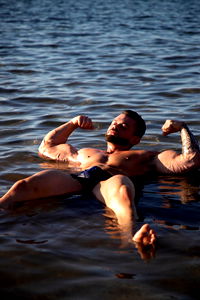 In this image, we encounter a striking scene of a man enjoying a refreshing outing on a beach. The man, who appears to be in his late forties, is a central figure in the frame. He is bare-chested, displaying a well-sculpted muscular body, with emphasis on his chest and stomach muscles. He is also donning a swim brief, hinting at possible participation in swimming activities. The man's physical strength and vitality are further highlighted by his surrounding environment. He is standing in the water, which is a vibrant blue, reflecting the equally bright sky above. The beach in the background contributes to the overall outdoorsy and invigorating atmosphere of the scene. The image seems to exude a sense of freedom, health, and active lifestyle. It communicates the joy of being in nature and the satisfaction derived from maintaining physical fitness. The man's confident posture and the open, expansive setting create a potent image of the joys of an outdoor lifestyle.
