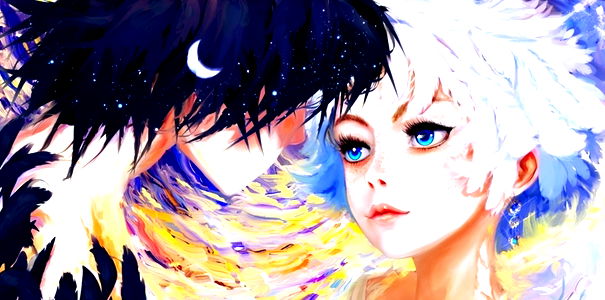 The image is a digital artwork depicting an anime-style character. The character appears to be a young adult, with striking blue hair and striking blue eyes. They are illustrated in a dynamic pose with a background that suggests an outdoor setting, possibly during the evening or at night, given the presence of a moon in the sky. The art style is vibrant and detailed, with rich colors and intricate details that suggest a high level of skill in digital illustration.
