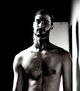This is a highly detailed black and white image of a well-built man. The man appears to be in his early thirties and has a masculine allure. His face is the primary focus, with the camera capturing an intense and focused expression. The man's facial features are sharply defined, adding to the overall intensity of the image. A unique aspect of this image is that the man is bare-chested, showcasing a muscular and fit physique. This not only highlights the man's physical strength but also adds a certain rawness to the image. The image also captures the man's upper body, including his chiseled chest and muscular neck. The man is not wearing any clothing on his upper body, further emphasizing his muscular build. He is positioned against a wall indoors, which provides a subtle, unobtrusive backdrop that allows the viewer to focus entirely on the man. The monochromatic color scheme enhances the picture's mood, giving it a timeless and classic feel. This portrait might be classified as nude photography due to the subject's lack of clothing on his upper body. It is a powerful image that combines raw physical strength with intense emotion, captured in a beautifully simplistic black and white style.