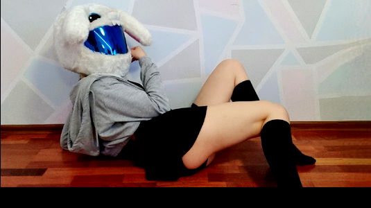 This is an image of Onlyfans model Bikereina, dressed as a bunny with blue eyes. She's wearing a black top and a short skirt, standing against a colorful wall. The model has her hair styled in blonde curls and appears to be posing for the photo.
