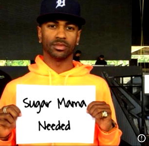 The model photo captures a moment of RealD holding a sign with the text 'Sugar Mama Needed'. The image appears to be taken at an event, possibly a convention or a promotional gathering. The individual is dressed in casual attire and has a confident expression. They are standing in front of a large screen displaying the logo of a sports team.
