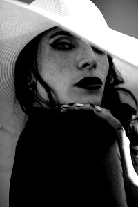 A striking black and white portrait of the OnlyFans model Black Magick Rose, exuding an edgy gothic vibe in a stylish hat. She captures attention with her intense gaze and dramatic makeup. Based in Los Angeles.