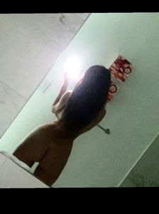 An image of the OnlyFans model u223425809 from Miami. The model appears to be a young adult female with long hair and is shown from behind in a full-body shot. She is standing in front of a bathroom mirror and appears to be in a room with white tiles on the walls.