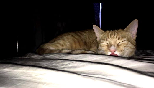 In this serene scene, the adorable orange tabby cat known as Blizzard Kaiser is peacefully sleeping on a bed. The soft glow of ambient light adds to the tranquil atmosphere. The furry feline seems to be in a state of deep rest, with its eyes closed and whiskers relaxed. It's a heartwarming snapshot that captures the simplicity and innocence of a pet's life.
