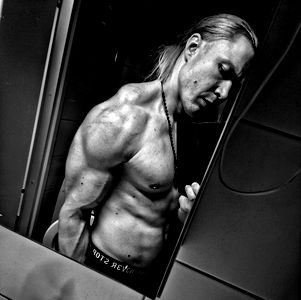 A bodybuilder poses confidently in his personal gym. Onlyfans model name is T. The photo captures a moment of intense training, highlighting the dedication and discipline required for such a lifestyle.