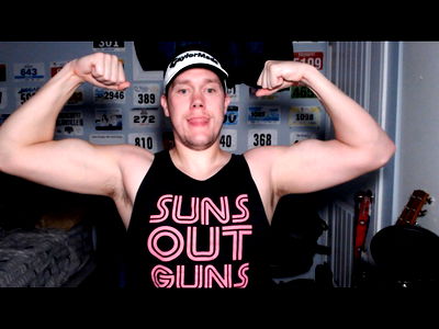 A young man wearing a sports tank top and pointing at the camera with his right hand, standing indoors with a casual background. He appears to be making a thumbs up gesture.