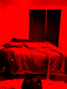 A dynamic model photo set in a vibrant room with a striking red and white color scheme, featuring the model BlvckDickDon in a pose that captures his energetic and confident personality. This image is perfect for an OnlyFans profile, highlighting the model's unique style and charm.