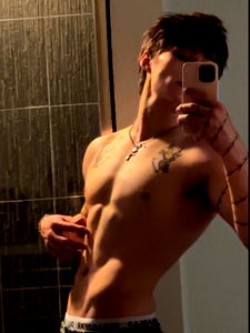 Bryce, a popular Onlyfans content creator, captures his chiseled physique with a mirror selfie in the bathroom. He's shirtless, showcasing his toned muscles, and has tattoo sleeves, reflecting his edgy style.