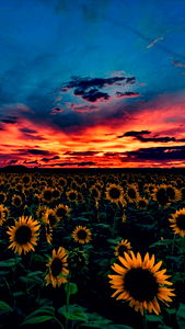 A serene evening scene with a field of sunflowers, set against the backdrop of a colorful sky at dusk.