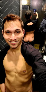 Anthony Revo, an Onlyfans model from Florida, is seen taking a selfie. He stands shirtless, flexing his muscles in a bathroom mirror. The image captures his confident and charismatic demeanor.