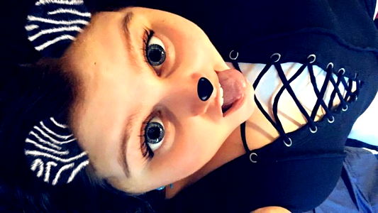 This is a close-up portrait of a young woman with striking makeup and a bold expression, capturing her as Bombshell Bandit.