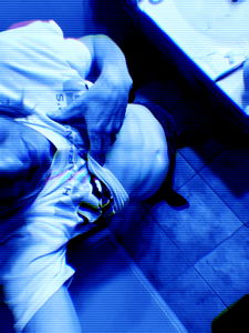 A photo of a fitness model in a bathroom mirror, showcasing his well-defined physique and tattooed bicep. He is shirtless and flexing his muscles, which indicate a strong dedication to bodybuilding.