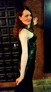Bonnie Brown, a model hailing from Bedfordshire, exudes confidence and style in this photo. She is wearing a chic black dress that complements her pose. The image captures her standing next to a door with a striking design, adding an urban touch to the overall composition.