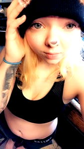 Photograph of a person, OnlyFans model LexiiMarie. A tattooed individual with blonde hair and blue eyes. They are wearing a black beanie, a sports bra and denim shorts. The image has been altered to include an overlay of text reading 'Onlyfans'.