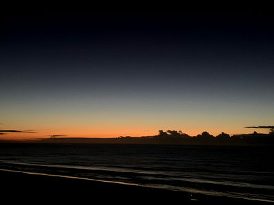 This image captures the breathtaking beauty of a beach during sunset. The sky transitions from warm orange hues to deeper blues, creating a serene and peaceful atmosphere. The water appears tranquil, reflecting the vibrant colors of the sky. The overall scene evokes feelings of relaxation and freedom.