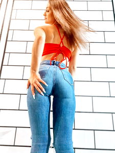 Brann โค๏ธ in a Denim Tight Photoshoot. The model is posing against a brick wall, flaunting a red bikini top with a low neckline that accentuates the fit of the blue denim pants. Her long blonde hair cascades down her back, and she stands confidently on one foot while looking over her shoulder.