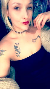 A woman with tattoos on her arms is sitting on a couch, dressed in a black dress and with her hand near her mouth. She has red lipstick on and appears to be posing for the photo. Her surroundings suggest a casual, indoor setting.