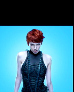 A striking fashion model posing in a futuristic outfit. Bree Daniels embodies the spirit of modern artistry and avant-garde design. Her fiery red hair and piercing gaze make her an enigmatic and captivating figure.