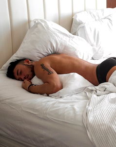 This is an image taken indoors, likely within a cozy bedroom setting. The central focus is a person who appears to be taking a nap, lying comfortably on a bed. The individual's face, though not clearly identifiable, suggests a state of deep relaxation, possibly even sleep. The bed is well-made, featuring bedding that includes a soft pillow and a blanket. The bed sheet and linens show a keen attention to detail, adding to the overall comfortable ambiance. The bedclothes, although not the primary focus, contribute to the warm and inviting atmosphere of the scene. The background features a wall, indicating that the person is likely lying against it or towards it. This further suggests that the person is in a secure and familiar environment, possibly their own bedroom. The overall mood of the image is one of tranquility and serenity, capturing a moment of rest or sleep. It paints a picture of a peaceful retreat, a haven where one can escape the hustle and bustle of everyday life and find comfort in the simple act of laying down for a nap.