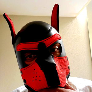 BStarr, a person in a dog costume with a full-body mask and armor, is standing indoors next to a mirror. The costume features a red mask and black armor, and it appears to be an adult male. He has short hair and is wearing glasses. He is holding a camera in one hand and another object that resembles a dog's collar with a bone-shaped emblem in the other. The person is also wearing a black vest over his costume. Behind him, there are two towels hanging on a wall rack. The scene has a playful and humorous vibe.