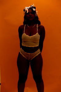 This image features a woman posing in lingerie and casual wear. The model is standing outdoors with her hands casually placed on her hips, looking directly at the camera. She has a friendly expression on her face.