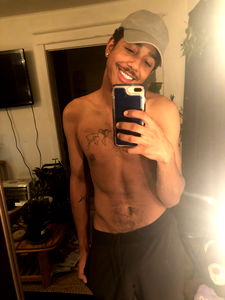 In this image, OnlyFans model Deon is caught in a moment of lighthearted fun. He's casually dressed in a simple gray shirt, his tattoos adding an urban touch to his look. His playful expression and pose suggest he's enjoying his time, perhaps taking a break from his busy schedule. The phone in the background adds a personal touch, hinting at his daily life away from the camera. Deon is likely to be in his late twenties or early thirties, judging by his appearance.