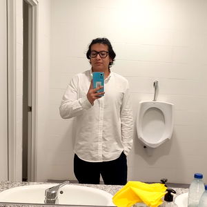 In the image, we see a model posing confidently for a mirror selfie. He is dressed in a smart-casual ensemble with a white shirt and blue jeans, exuding a relaxed yet stylish vibe. The background reveals a bathroom setting with a sink and toilet paper holder. A blue toothbrush rests on the countertop next to the sink, hinting at personal hygiene routines. The model's attire suggests he might be in his early twenties or thirties.