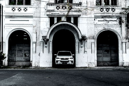 A sleek car parked on the street, in front of a grand building. The vehicle's glossy surface gleams under the city lights.