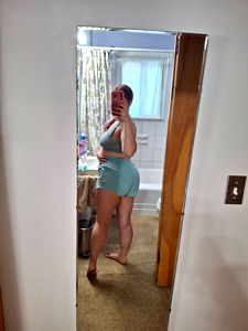 A young woman is captured in a mirror selfie. She is wearing a light blue top and dark shorts, and her pose suggests confidence. The background shows a room with a white door and part of a kitchen counter. Her expression is one of joy, indicated by the emoji she's using to capture this moment.