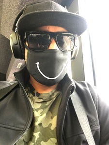 In the image, a man is sitting in what appears to be public transportation. He's wearing sunglasses with a smiley face emblem, a black baseball cap, a mask covering his face, and a camouflage jacket. The setting suggests he might be commuting or traveling.