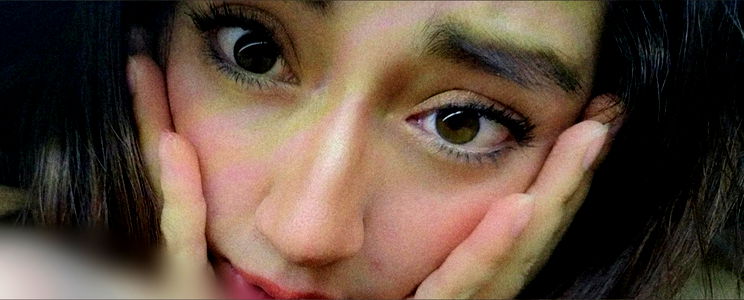 An adult model posing in a purple-lit room. She appears to be young with glasses and is showcasing her body confidently.