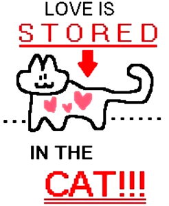 The image features a cartoon cat, humorously warning that there is a cat in the building. The cat's message seems to be a light-hearted joke about how cats are known for hiding things. The image also includes the text 'Love is stored in the cat'. This is a cute and fun way of using an image to convey a message, likely related to the idea that cats can store memories or emotions.