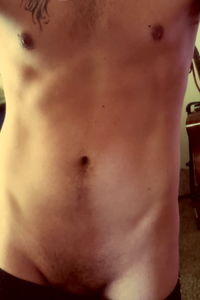 Model photo of Onlyfans model, with visible tattoos and a well-defined upper body. In the background, a bathroom fixture is partially visible.