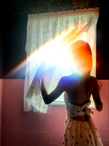 This image depicts a person with short hair, styled with a headband. They are holding a smartphone and standing next to a sink in what appears to be a bathroom. The individual is wearing a floral-patterned dress and has multiple tattoos visible on their arms. Their attire suggests a casual yet fashionable aesthetic.