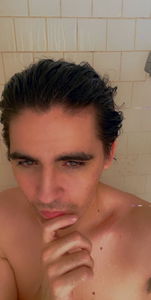 A man, known as ButtholePilates, takes a shower selfie with a thoughtful expression and wet hair. A wall of white tiles surrounds him. His pose suggests he is fully engaged in the moment.