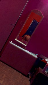 An OnlyFans model, Ruth, captured in a mirror selfie. She appears to be mid-dance or pose, dressed in a revealing, black lingerie with transparent straps. Her back is turned towards the camera, displaying her underwear and the curve of her hips. The image has a moody, vibrant red ambiance, which adds an alluring vibe to the scene.