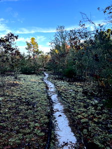 In the image, a bearded man with visible tattoos and piercings is standing outdoors. He appears to be shirtless, posing with his arms crossed. The setting seems to be a forest or wooded area, with trees and vegetation in the background. The individual exudes a rugged and tattooed aesthetic.