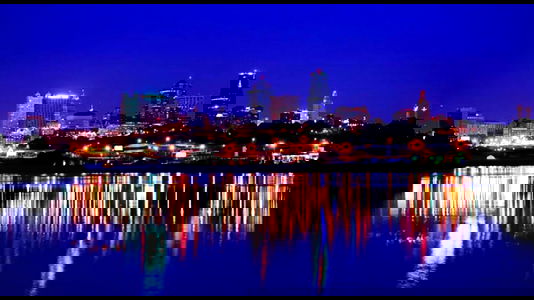A captivating nighttime view of the Kansas City skyline, with colorful lights reflecting off the water. The scene is a picturesque cityscape with a calm river flowing through it.