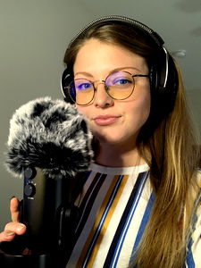 A young adult female holding a microphone in front of her. She is wearing glasses, has blonde hair styled in a bob cut, and is dressed casually with a striped shirt and earrings. Behind her is a background featuring a white wall. The environment suggests she is engaging in an activity related to podcasting or voice-over work.