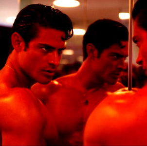 A well-built man in his mid to late twenties with a strong, defined physique. He is holding a tennis racket, suggesting he might be interested in sports or training. The pose suggests a confident, proud demeanor. The background is nondescript, placing the focus on the model.