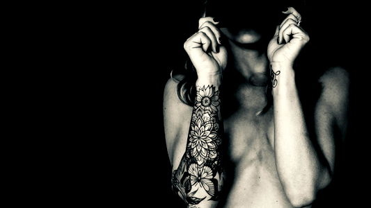 This striking image captures a tattooed model in a black and white indoor photo shoot. The model is a young woman, approximately 29 years old, with detailed tattoos that add a unique ornamental quality to her skin. The tattoos, which seem to be expertly done, are located prominently on her chest and shoulder, contributing to an overall aesthetic that is both rebellious and artistic. She is standing against a wall, which serves as a neutral backdrop, allowing the viewer's attention to focus solely on her. The light plays off her flesh in a way that highlights the contours of her body, emphasizing the artistic nature of the tattoos and adding a sense of depth to the image. Her face, the centerpiece of the image, is expressive and alluring. She gazes directly into the lens, creating an intimate connection with the viewer. This is not just a portrait of a young woman, but an exploration of individuality, personal expression, and the artistry of tattoos rendered in a monochromatic scheme. The photo shoot effectively blends fashion, art, and personal identity into a single powerful image.