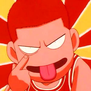 The image is a vibrant and energetic piece of anime art featuring a male character with a playful expression, making a silly face with his finger. The background is adorned with a bold red and yellow explosion effect, adding to the lively atmosphere of the artwork.