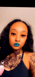 This is a photo of an OnlyFans model, Cantrelle. She has tattoos on her arms and is wearing blue lipstick. Her pose suggests she is promoting herself or her content. The background is simple, which puts the focus on her.