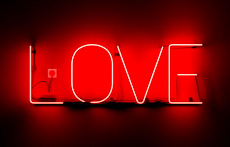 The image showcases a striking red neon sign with the word 'Love' written on it. The background features a dark space with a hint of blue lighting, highlighting the sign and creating an artistic atmosphere. The phrase 'Onlyfans Model CJluv' is subtly placed at the bottom of the photo, indicating the model's presence or endorsement of the image. This piece could be associated with Miami's urban art culture, where such installations are popular.