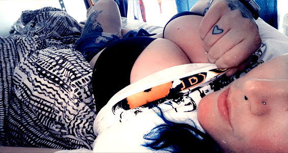 Model Cat from OnlyFans exuding a laid-back summer vibe. Tattooed, pink hair, sunglasses and tattoos galore.
