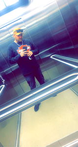 A man standing inside an elevator, holding a bottle and a smartphone. He is casually dressed and appears to be mid-stride as he captures the image. The elevator has a modern design with stainless steel walls and buttons on one side.