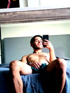 A shirtless model with a cell phone, Charlie Daniels captures the relaxed atmosphere of a personal space. He is seen reclining on a bed with an iPhone in his hand, showcasing a moment of leisure. The room features a comfortable-looking bed and a casual environment.