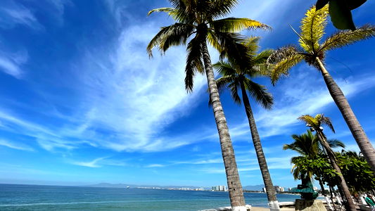 This image captures a serene beach scene featuring tall palm trees against the backdrop of a clear blue sky. The warm, tropical atmosphere is perfect for relaxation and leisure activities. The location appears to be a popular spot for tourists looking to unwind in the sun.