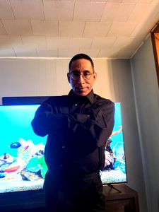 In the image, there is an individual standing confidently in front of a flat screen TV displaying a fish tank. The person is wearing a black outfit and has short hair. They have their arms crossed and are looking directly at the camera with a slight smirk on their face. Behind them, the room features a blue wall, a beige carpet, and a light fixture on the ceiling. There is also a wooden cabinet in the background. The image appears to be taken during daylight as the lighting suggests natural light coming from outside the frame.