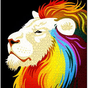 Artistic representation of a majestic lion's head, highlighted by its vibrant rainbow mane.